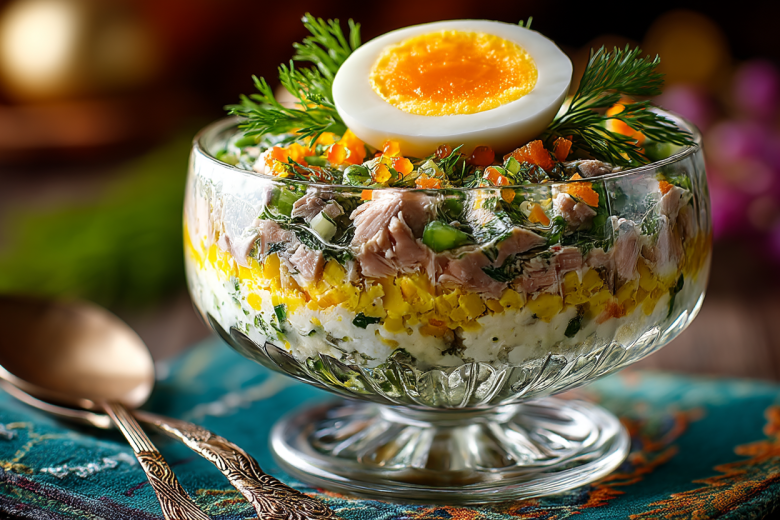 Особенность этого рецепта — добавление сильно охлаждённого сливочного масла. Оно, тая, обволакивает ингредиенты, создавая по-настоящему нежную, бархатистую текстуру, которая выгодно отличает этот вариант от других интерпретаций «Мимозы».