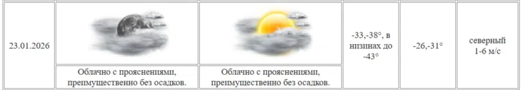 «Прогнозы погоды в Курганской области на 23 января. Облачно с прояснениями, преимущественно без осадков. Температура ночью составит -33...-38 градусов, в низинах до -43 градусов. Днём температура составит -26...-31. Ветер северный 1-6 м/с», — поведали в ЦГМС.