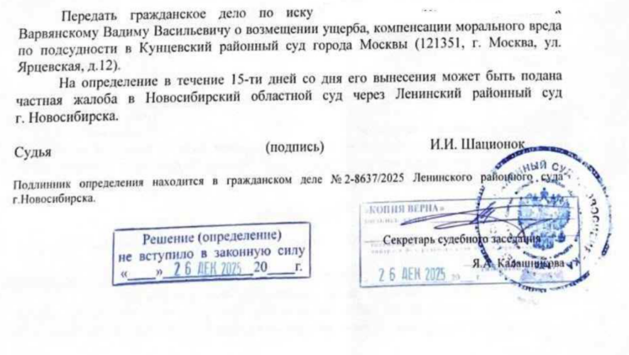 Иски о компенсации морального и материального ущерба, которых ждали больше года, вдруг перенесли в Кунцевский районный суд Москвы. Туда, где, по версии суда, проживает Вадим Варвянский.